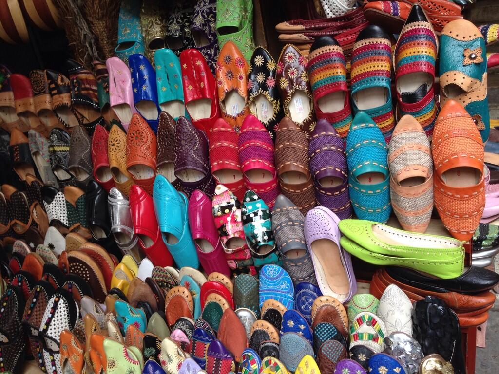 Fas'ta deriden yapılmış terlikler, çantalar dükkanları rengarenk süslüyor.